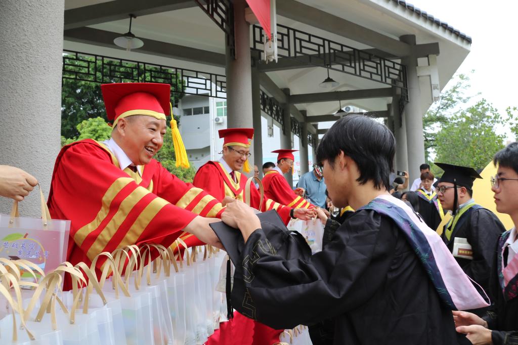 毕业典礼后,校领导们还在静明湖旁为毕业生们送上学校精心准备的毕业芒果礼。