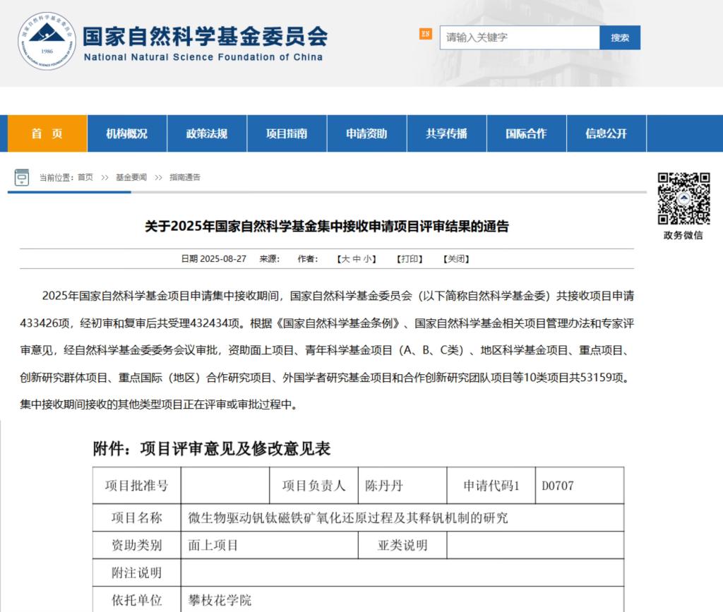 近日,国家自然科学基金委员会公布了2025年度集中申报期项目评审结果,beat365生化学院减污降碳与资源化研究团队陈丹丹副教授主持申报的《微生物驱动钒钛磁铁矿氧化还原过程及其释钒机制研究》课题在其博士阶段成果积累和团队长期的研究下成功获批面上项目。这也是陈丹丹老师继2022年国家自然科学基金青年基金项目后,再次获得该类项目资助,体现了其科研工作的延续性与创新性,彰显了其深厚的学术积淀和强劲的科研创新能力。