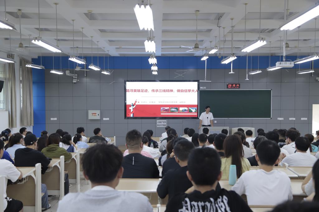 石维富以《踏寻英雄足迹,传承三线精神,做自信攀大人》为题,从“123456”城市密码切入,回顾了成昆铁路大会战的悲壮历史与老一辈建设者的豪迈誓言,他希望新生赓续成昆精神,弘扬“艰苦创业、无私奉献、团结协作、勇于创新”三线精神,以“自信、实干、创新”姿态,将青春奋斗融入强国复兴伟业。