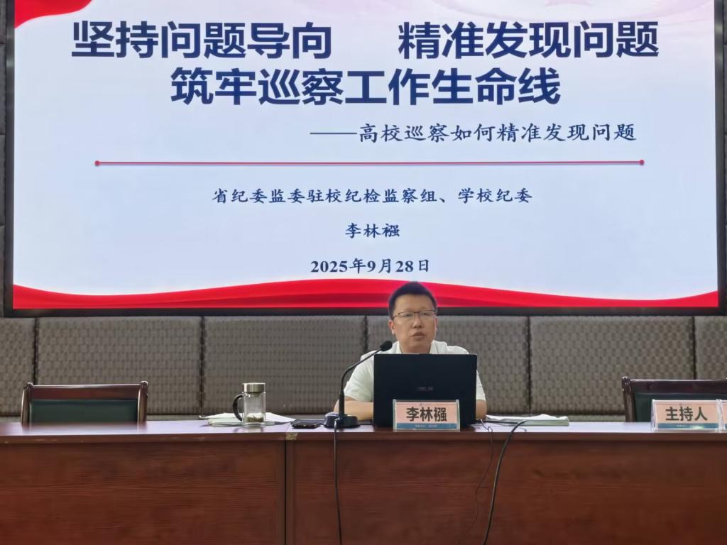 9月28日上午,省纪委监委驻校纪检监察组组长、校党委副书记、纪委书记、巡察工作领导小组常务副组长李林襁以“坚持问题导向,精准发现问题,筑牢巡察工作生命线”为题作专题辅导。他对“模拟问题、核实问题、问题台账、突出问题与线索问题”的“四步走”工作法进行了系统阐述,为精准发现、深入研判问题提供了清晰的方法路径。他指出,巡察干部要牢固树立问题意识,增强发现问题的敏锐性和精准度。