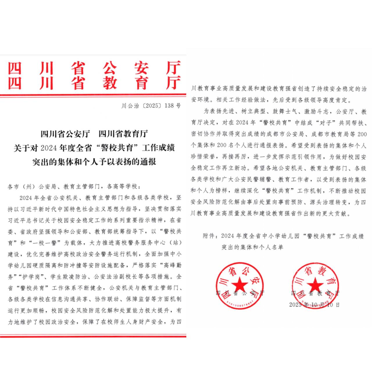 近日,四川省公安厅、四川省教育厅联合下发《关于对2024年度全省“警校共育”工作成绩突出的集体和个人予以表扬的通报》,对在全省“警校共育”工作中作出突出贡献的集体和个人进行表彰。beat365在线唯一官网被评为“成绩突出集体”,学校保卫处综合科科长程桥同志被评为“成绩突出个人”。