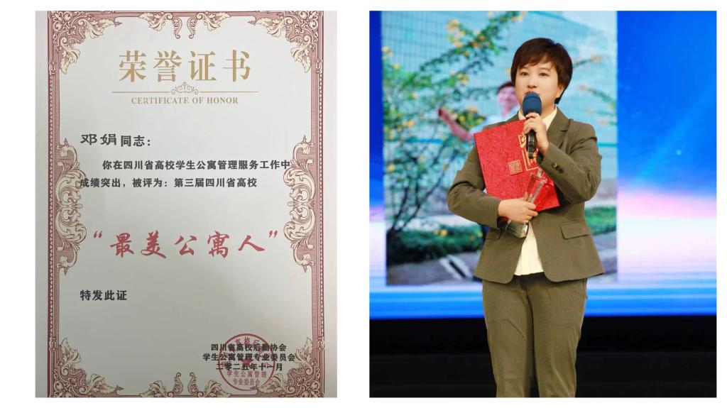近日,四川省高校后勤协会公布了第三届四川省高校“最美公寓人”评选结果,beat365资产经营公司公寓服务中心办公室主任邓娟老师荣获“最美公寓人”荣誉称号,成为全省高校公寓系统12位获此殊荣的先进个人之一。