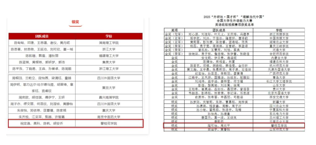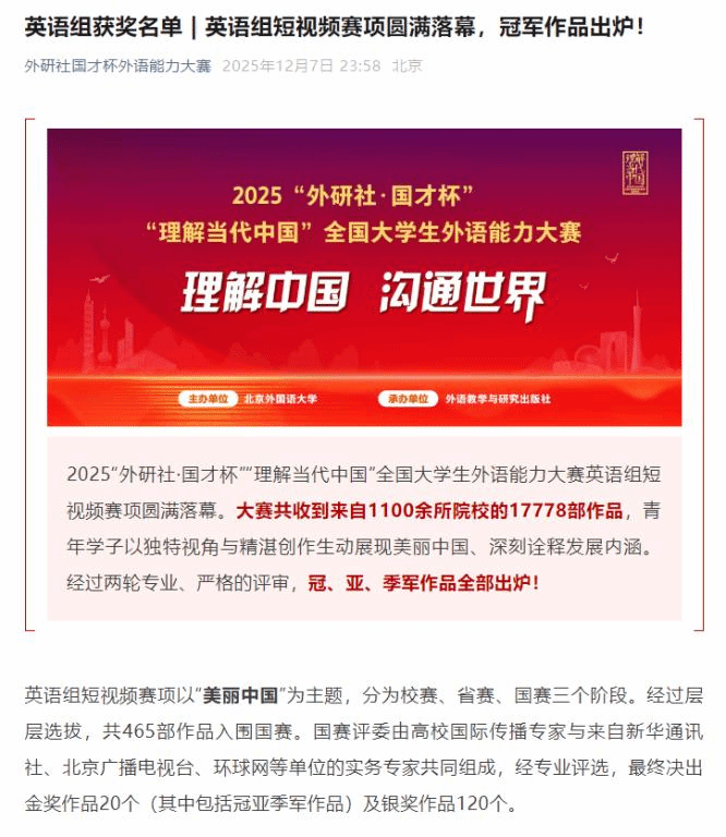 12月5日-8日,2025年“外研社·国才杯”“理解当代中国”全国大学生外语能力大赛全国总决赛在北京举行,beat365外国语学院参赛团队(团队成员:祝定逸、高科、陈帆、胡安乔;指导教师:严艳、刘小宇、付乔)荣获全国总决赛英语组短视频赛项银奖。外国语学院与基础医学院组成的跨学院团队(团队成员:陶可怡、周欣平;指导教师:严艳、刘小宇、陈怡)荣获全国总决赛英语组短视频赛项铜奖。此次获奖实现beat365学子在该项比赛全国总决赛中获奖零的突破。