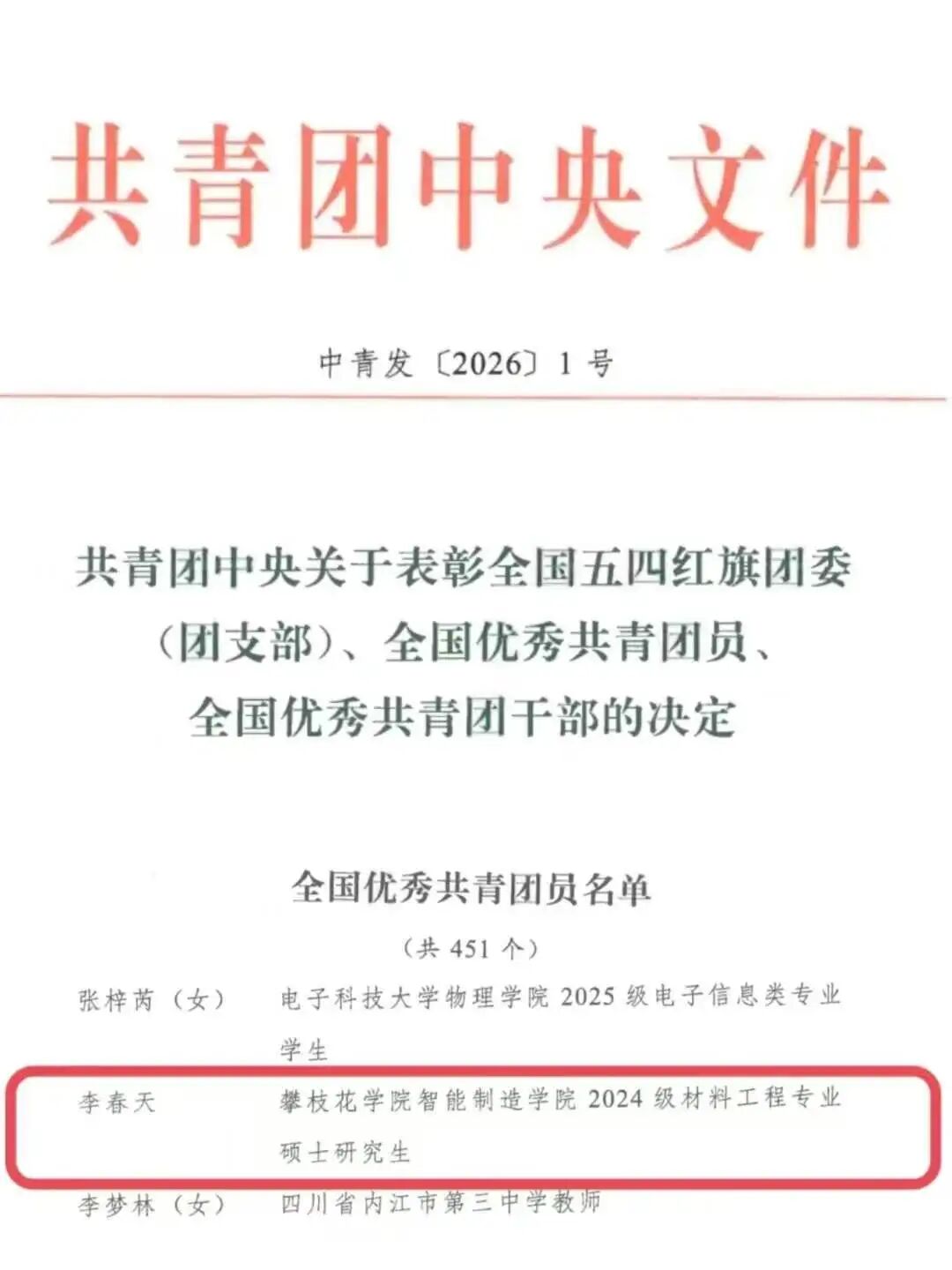近日,共青团中央公布《关于表彰全国五四红旗团委(团支部)、全国优秀共青团员、全国优秀共青团干部的决定》,beat365智能制造学院2024级材料工程专业硕士研究生李春天同学荣获“全国优秀共青团员”称号。作为共青团系统授予团员个人的最高荣誉,四川省共有27名团员获评,李春天同学与西南石油大学、电子科技大学的学生一同获评。