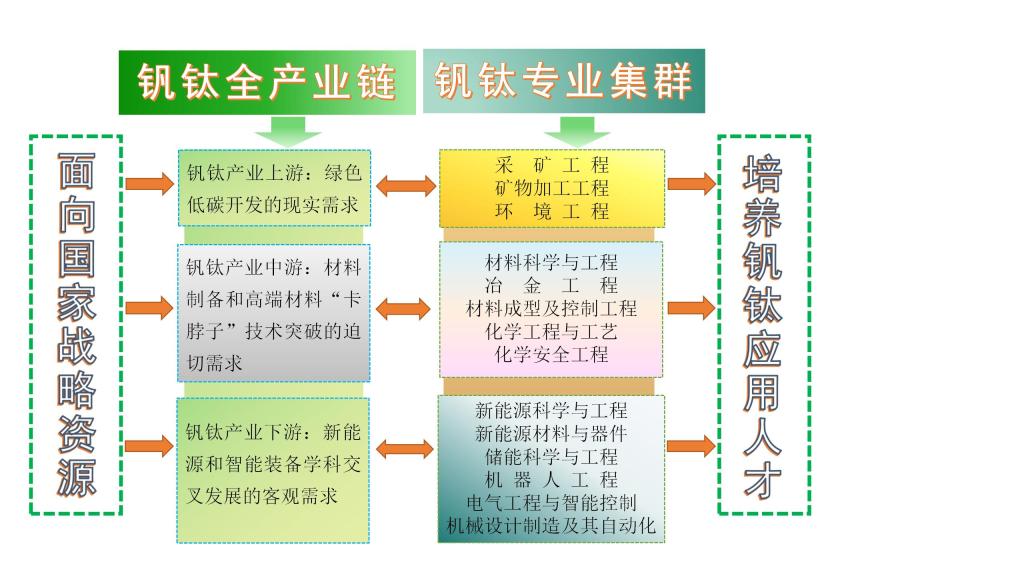 一是构建钒钛战略科教新高地,服务国家战略资源开发与钒钛产业升级举措更加明确,实现多学科交叉和资源整合。二是服务钒钛资源上游绿色开发需求,特别是四川省委省政府重点推进的红格南钒钛磁铁矿开发利用项目,在采矿工程、矿物加工工程基础上,培育智能采矿,支撑国家绿色矿山智能化钒钛产业基地建设。三是突破中游材料高端化瓶颈,以国家一流专业材料科学与工程为核心,联动冶金工程、材料成型及控制工程专业,打造低碳冶金、高端钒钛原材料、资源循环等特色方向,破解钒钛材料“卡脖子”难题。四是补齐下游新能源与智能装备延伸短板,加快建设新能源科学与工程、储能科学与工程、新能源材料与器件专业,形成“钒钛新材料及智能装备”专业群,推动产业向能源动力、装备制造领域拓展。