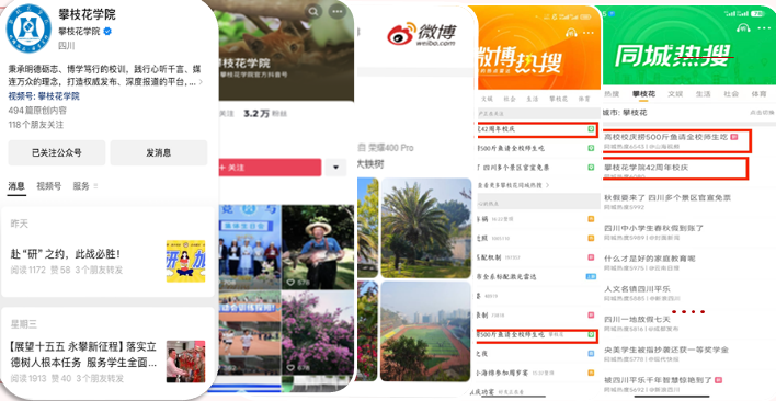 外宣工作成效显著。聚焦学校大事要事,通过中央、省市主流媒体平台,聚力借力传播应用型高校的鲜明特色,“十四五”期间,在国家级和省市主流媒体集中宣传报道上千次,收获上亿级阅读、浏览、点赞和评论。由党委宣传部牵头组织开展的“自律攀大人 温暖回家路”新闻被央视CCTV【第一时间】栏目、CCTV13【新闻直播间】栏目等全国10多家媒体进行报道。学校帮扶木里县的事迹登上央广网,“三线建设与西南民族地区现代化发展成就观察团队”活动报道被光明网转载,并在新华网客户端展现。《自律•启程》毕业专题视频、《欣于所遇》招生宣传视频被人民网人民视频客户端、中国大学生在线转发。有力提升了学校的影响力、传播力,知名度和美誉度。