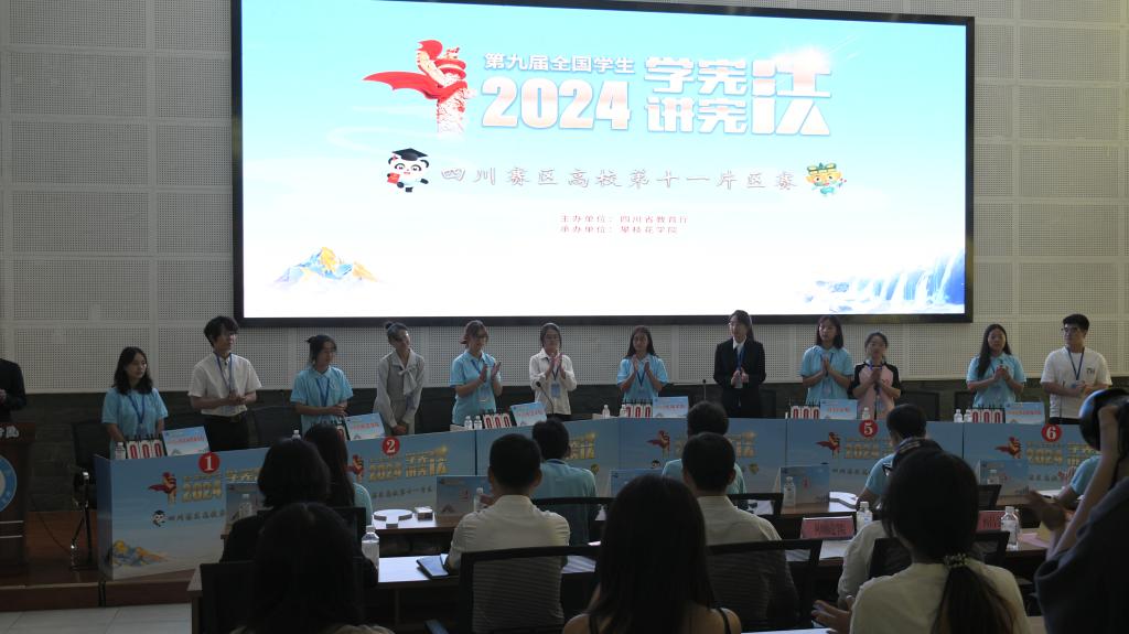 强化安全素养,深化学生生命安全教育,制定年度安全教育工作方案,签订安全教育责任书,不断压实安全教育责任;前置风险防控关口,新生身心健康排查承诺书签订率100%。抓实法治教育,组建师生普法宣讲团、禁毒防艾同伴宣讲团,开展各类宣讲65场次,学生宪法卫士参与率超90%,学校于2023年获省级学宪法素养竞赛一等奖。(第九届四川省“学宪法讲宪法”高校组第十一片区素养竞赛图片)