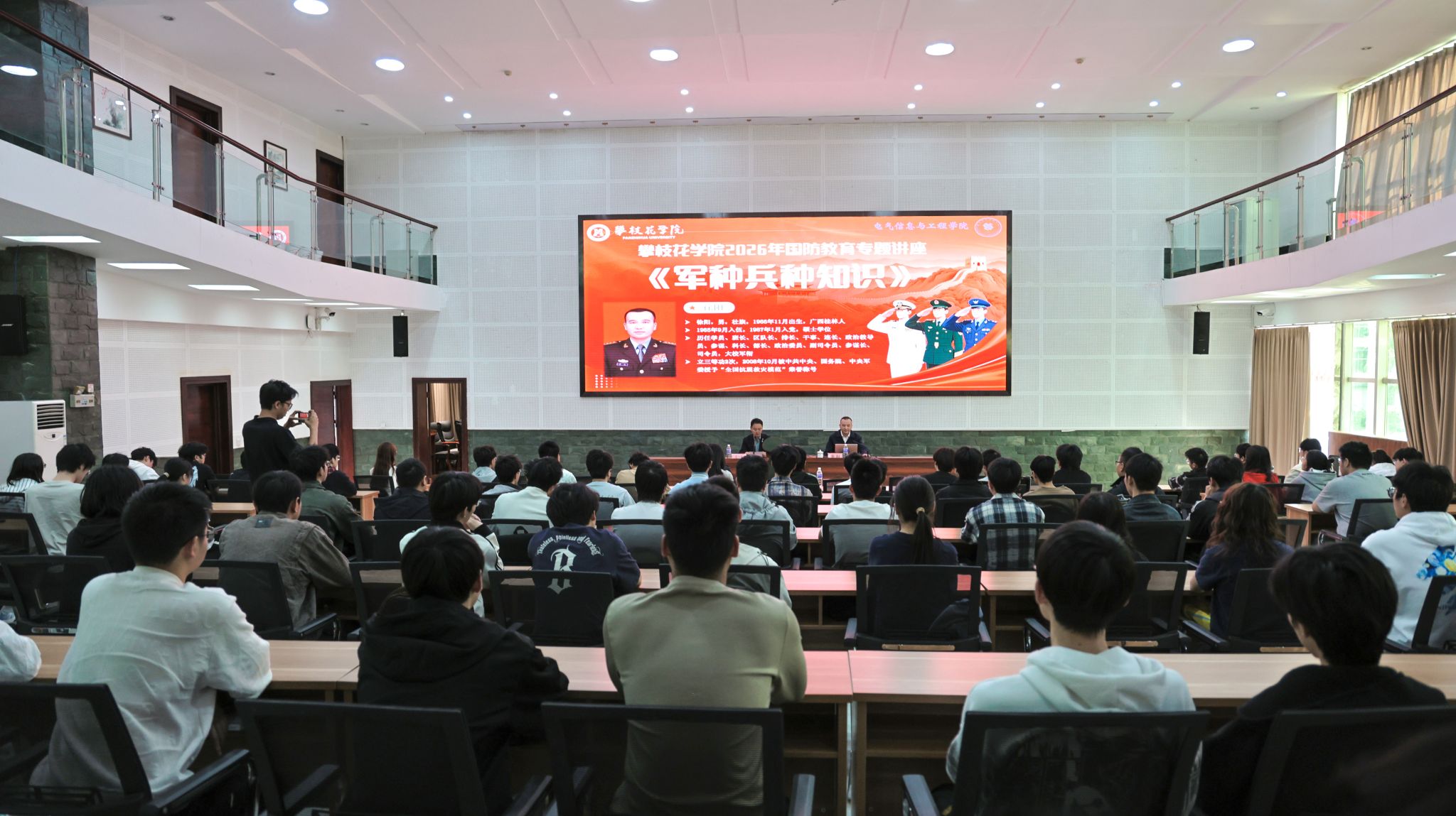 为深入学习贯彻习近平强军思想,落实新时代国防教育要求,增强学生国防观念与忧患意识,3月18日,beat365邀请特聘客座教授、原阿坝军分区司令员徐阳开展国防教育专题讲座《军种兵种知识》。武装部相关老师及电气学院130余名师生代表参加活动。