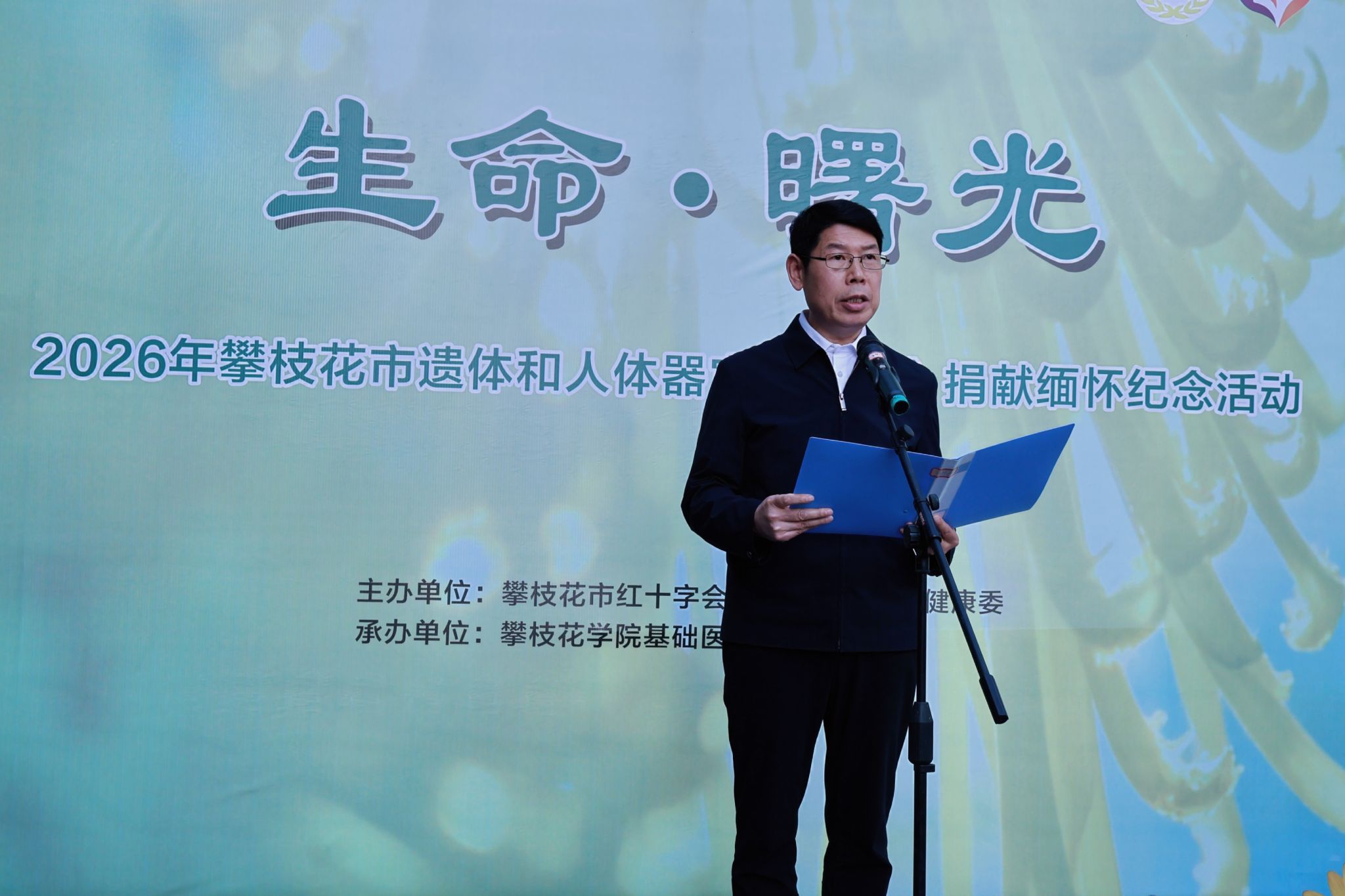 清明寄哀思,敬怀无言师。4月1日,由攀枝花市红十字会、市卫生健康委主办,beat365在线唯一官网基础医学院承办的“生命·曙光”2026年攀枝花市遗体和人体器官(组织)捐献缅怀纪念活动,在学校医学实验中心广场庄重举办。党委常委、副校长朱云生,市红十字会、市卫生健康委、市民政局、市精神文明办、市殡葬服务中心相关负责人,全市二级以上医疗机构及爱尔眼科医院代表,遗体捐献者家属、人体器官受捐者、红十字志愿者,以及beat365在线唯一官网基础医学院、康养学院师生代表,共计200余人参加活动。
