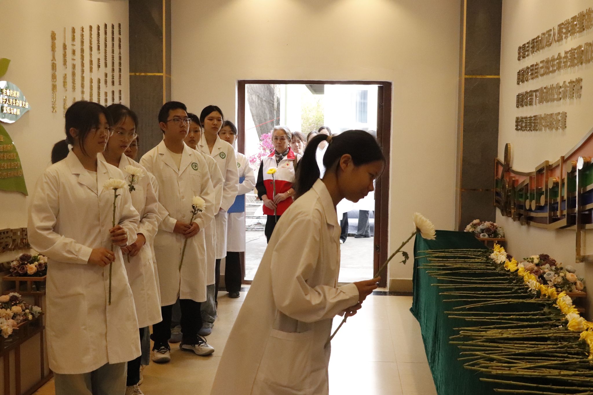 仪式尾声,全体人员前往纪念园,敬献鲜花、深鞠一躬,寄托哀思。基础医学院自2019年起,已连续8年开展清明祭奠大体老师活动,该活动现已纳入学院课程思政实践体系,成为医学人文教育核心课程。学院始终将生命教育、医德教育贯穿育人全过程,以仪式教育引导学生感悟生命意义、坚定从医信念,着力培养新时代高素质医学人才。