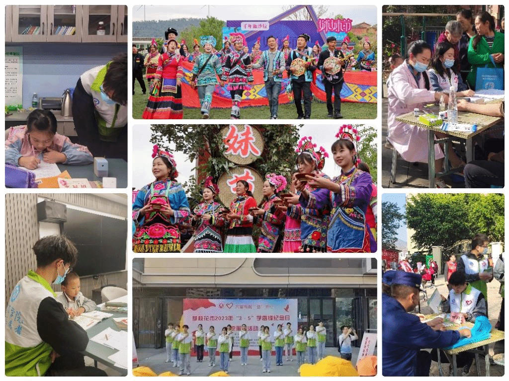践行志愿服务,传递爱心火炬。学生志愿服务大队组织带领志愿者参与各种社会实践,以实际行动传承雷锋精神。在仁和区平地镇迤沙拉村参与“姊妹节”开幕式志愿服务工作,助力迤沙拉人文故事传播和当地旅游业发展;在仁和区银华社区参加雷锋日活动,进行了健康义诊、义剪、传统盲人按摩、消防知识宣传等惠民活动;在万达广场进行义演,提高群众对残疾人士的关注度;在“守护朝花”专项组开展“晚辅进社区”活动,组织了形式多样的学雷锋实践活动。