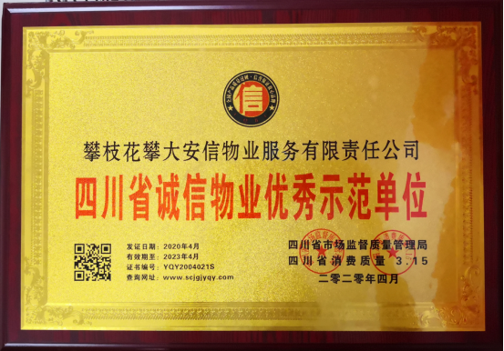 近日获悉,攀枝花攀大安信物业服务有限责任公司荣获“四川省诚信物业优秀示范单位”称号。