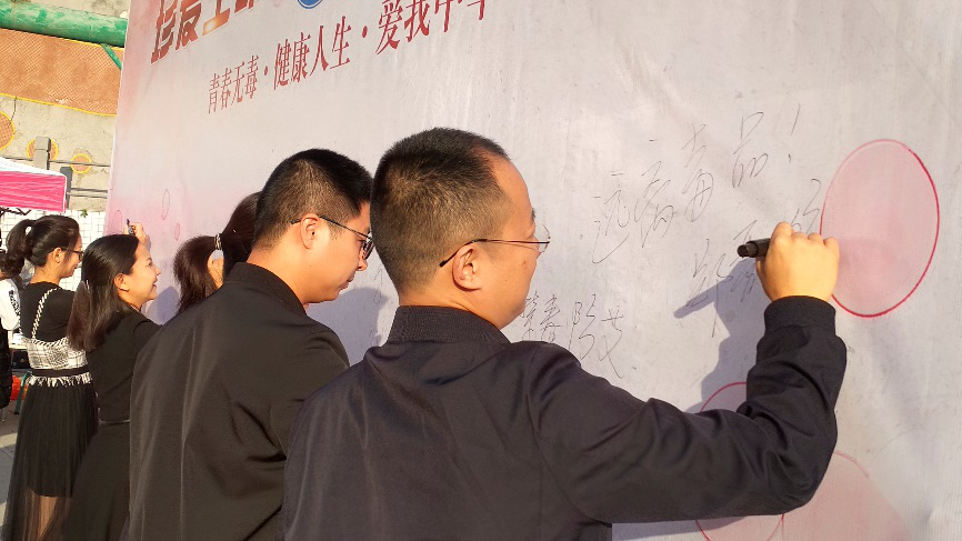 活动中,学生代表范亚科带领全体人员进行禁毒宣誓;何晓燕带领大家在禁毒签名墙上郑重的签上自己的名字,并作出“青春无毒、健康人生、爱我中华”的保证。活动最后,攀大学子以表演节目的方式,向大家展示了一种新颖的禁毒宣传形式。