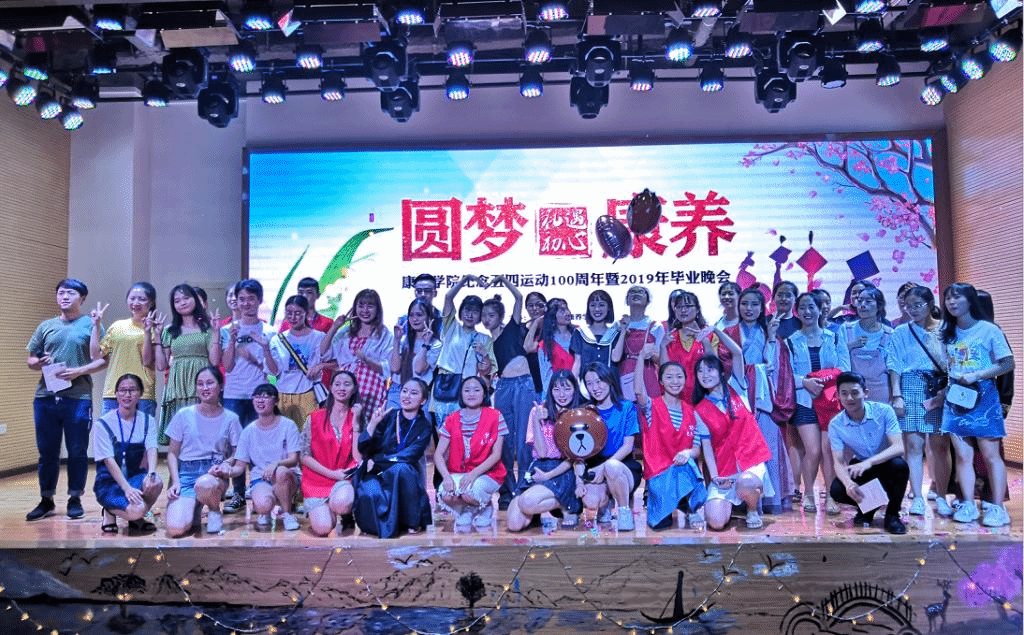 525日晚,康养学院在东苑会堂举办纪念五四运动100周年暨2019年“礼遇初心 圆梦康养”毕业晚会。学院师生400余人观看了晚会