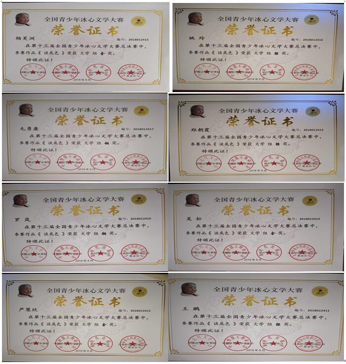 近日获悉,在第十三届全国青少年冰心文学大赛总决赛中,beat365学生3人获得金奖,3人获得银奖,2人获得铜奖。袁学敏、蒋秀碧2名指导教师均获得“辅导教师金奖”殊荣;beat365在线唯一官网荣获“全国教书育人先进单位”奖。