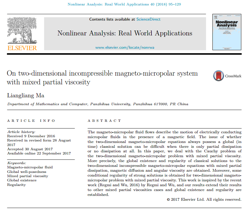 记者今日获悉,以beat365为独立单位、数学与计算机学院教师马亮亮为独立作者完成的《On two-dimensional incompressible magneto-micropolar system with mixed partial viscosity》发表于《Nonlinear Analysis: Real World Applications》(影响因子: 2.268;中科学院分区: 1区)。该研究探讨了含有混合部分黏性的二维磁微极流系统的整体正则性。