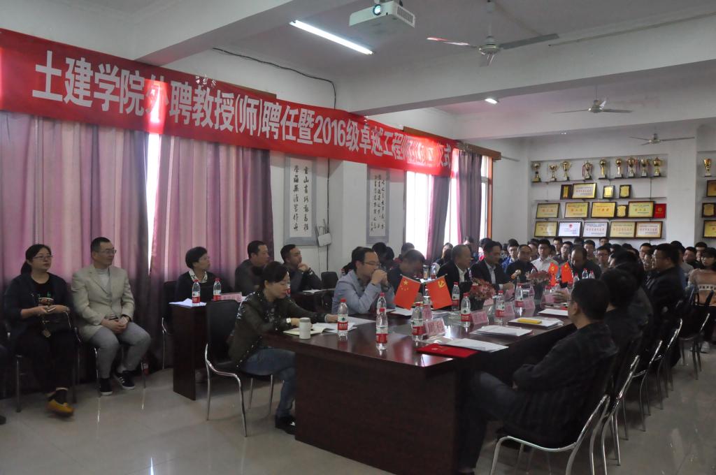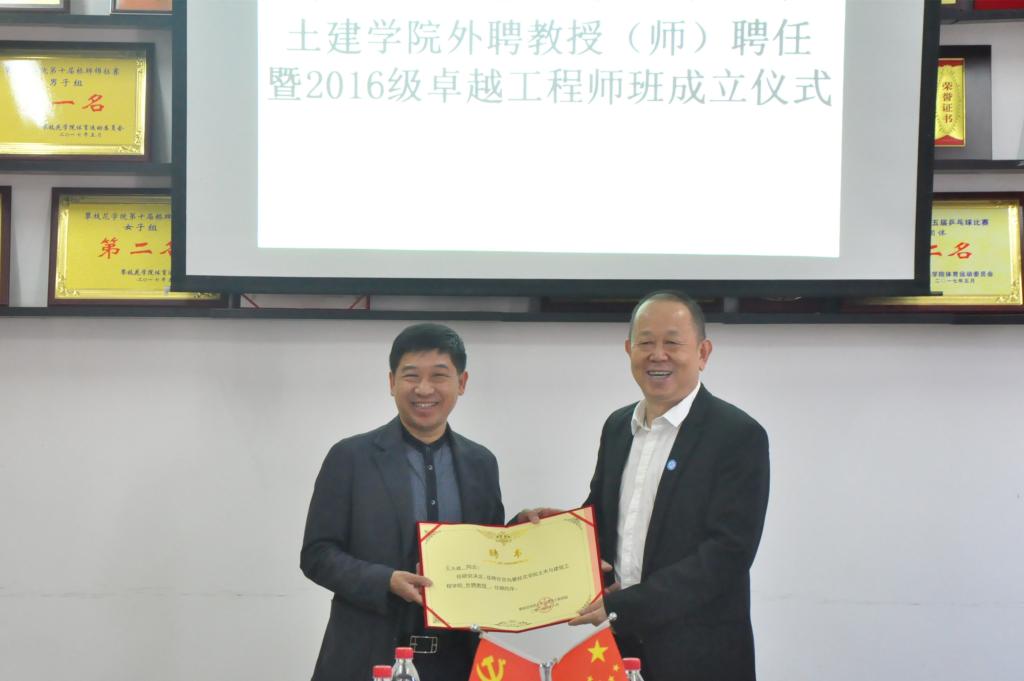 11月12日上午,beat365土建学院于砺志楼二楼会议室举行了土建学院外聘教授(师)聘任暨2016级卓越工程师班成立仪式。校党委书记肖立军参加仪式,并为24名建设领域专家学者颁发外聘教授(师)聘书。会议由土建学院党委书记主持。土建学院院领导、各科室负责人,外聘教授(师)、优秀校友、卓越工程师班全体师生参加仪式。