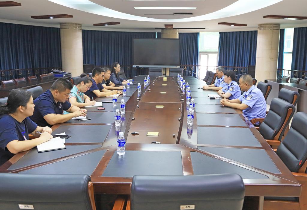 保卫部(处)相关负责人感谢市、区公安局以及临江路派出所对学校安保工作的支持,并介绍了学校安保工作基本情况和学校疫情防控工作情况、秋季学期防控措施情况。派出所相关负责人介绍了两位驻校民警的基本情况和工作内容,并对“一校一警”驻校工作提出了要求。