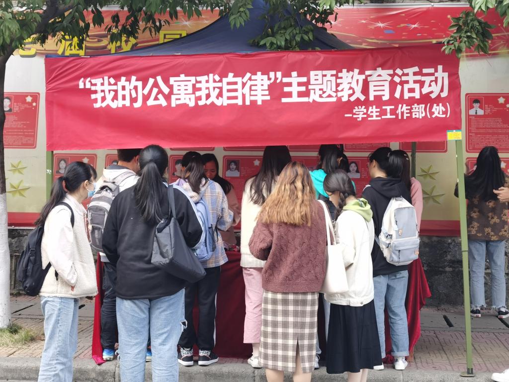 此次活动主要以展板宣传、线上答题、线下倡议、主题班团会等多种形式开展。通过线下摆点,累计发放2000余份宣传单,并结合线上“青春攀大”公众号宣传,向全校学生发出《我的公寓我自律倡议书》。活动开展过程中,学生处联合保卫处、后管处对二级学院活动开展情况、公寓内的安全、卫生和纪律进行了检查和督促,排查学生公寓中的安全隐患,督促同学们遵守学生行为准则。