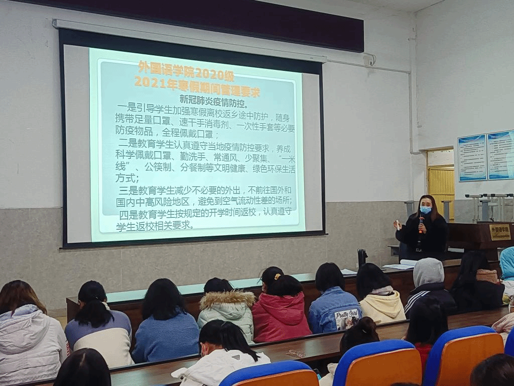 根据学校有关寒假学生工作暨疫情防控的要求,本次年级大会分别从往返途中、寒假中新冠疫情防控,生命安全教育,感恩教育,防诈骗、防校园贷、防溺水教育,离校前安全教育,加强自律攀大人学习等六个专题为同学们进行了宣传引导。本次年级大会在外国语学院多功能厅召开。