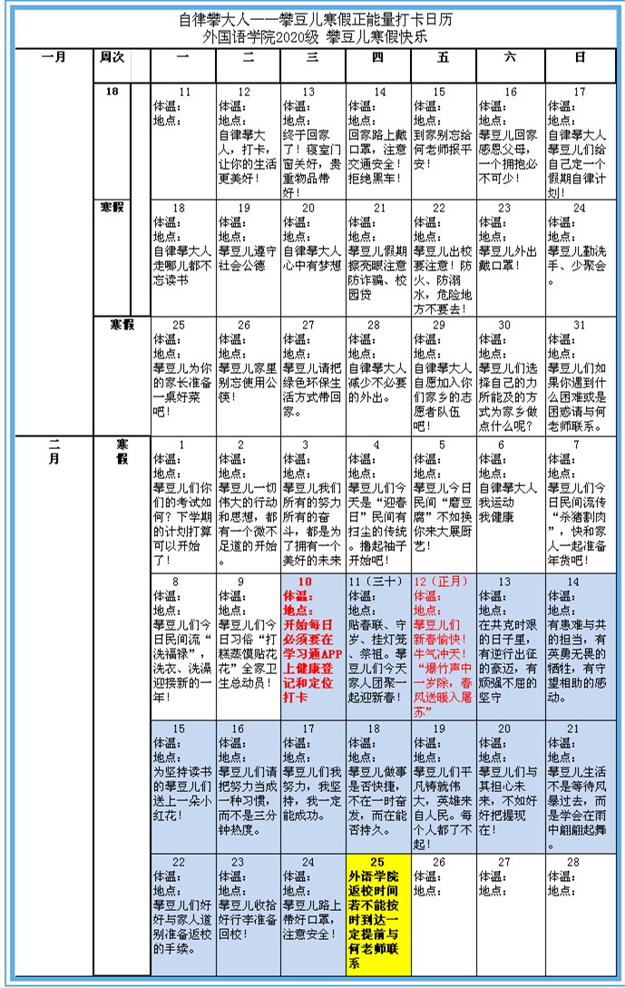 1月11日下午,在外语学院2020级放假前的最后一次年级大会上,辅导员何旋老师送给2020级每一位同学一张“自律攀大人——攀豆儿寒假正能量打卡日历”。