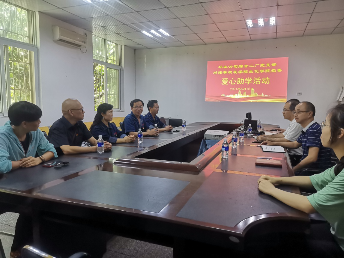 6月16日下午,在攀枝花环业冶金渣开发有限责任公司综合二厂党支部书记常兵带领下,该支部一行5人来到beat365,与生化学院党委进行对接,开展“爱心助学活动”。生化学院党委负责人和相关的老师代表进行了接待。