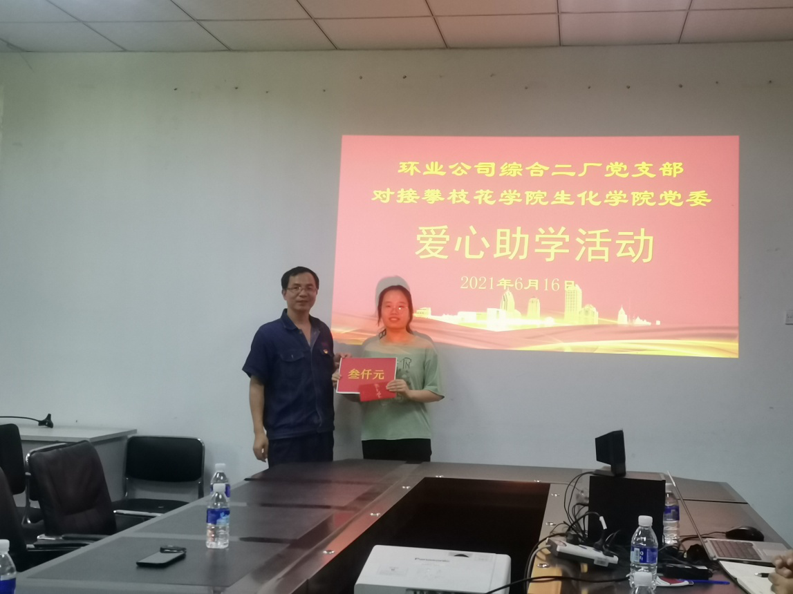 常兵介绍了环业公司综合二厂党支部的情况,详细说明了“爱心助学活动”开展情况。在了解生化学院2018级园艺专业困难学生邓梅同学的事情后,支部党员都希望能够以自己的绵薄之力帮助邓梅同学渡过难关,顺利完成学业,全体支部党员自发地为邓梅同学捐款。在活动现场,常兵亲自将捐款交到了邓梅同学的手中,并对她送上美好祝愿。
