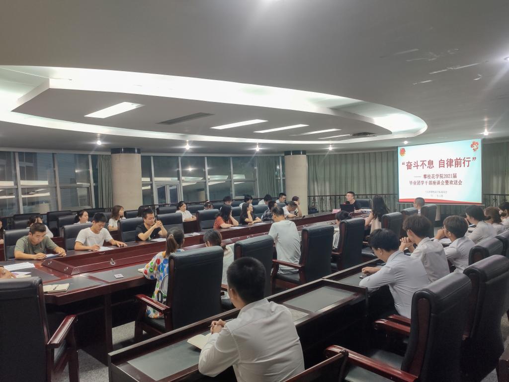 6月17日晚,团委在办公楼四楼会议室举行“奋斗不息自律前行”2021届毕业团学干部座谈会暨欢送会。团委负责人、各校级学生组织指导老师、2021届毕业团学干部、校级学生组织干部代表共计50余人参加座谈会。