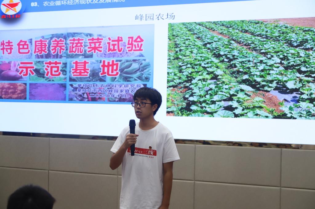 本次调研成果汇报共分为“点亮•梦想”、“蜕变•成长”、“绽放•青春”三个篇章,分别以《西区三线文化在青少年思想教育中的价值及实践研究》、《攀西地区金沙江攀枝花段水域生态资源保护的调查研究》、《基于农业生态循环模式的西区乡村产业振兴研究》、《新媒体时代攀枝花西区红色资源开发利用调查报告——以“初心园”为例》、《加强功能协同,针对西区公共卫生服务能力的调查研究》为题进行分享汇报。