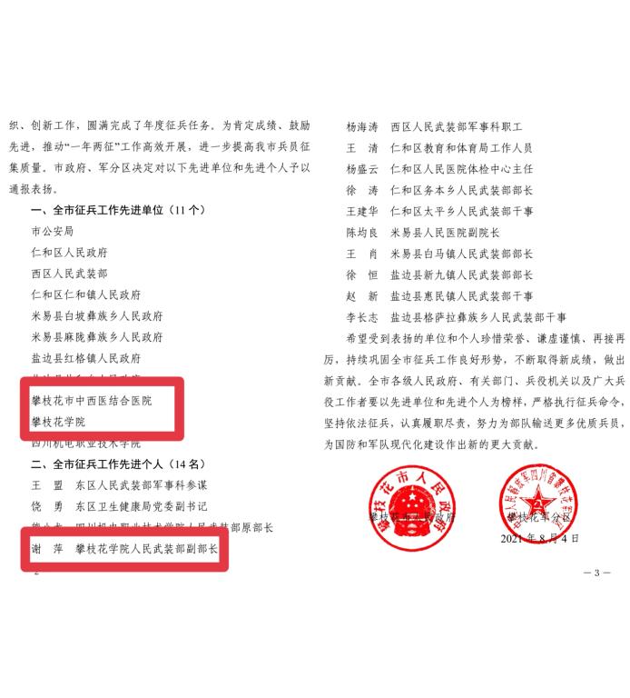 近日,攀枝花市人民政府、攀枝花军分区通报表扬在2020年征兵工作中的先进单位和先进个人,beat365和附属医院荣获“全市征兵工作先进单位”荣誉称号,谢萍同志荣获“全市征兵工作先进个人”荣誉称号。
