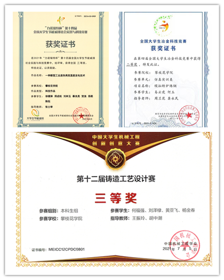 上述赛事分别由教育部高等学校相关专业教学指导委员会、中国机械工程学会等机构主办,代表国内较高水平的实践类学科竞赛。钒钛学院紧跟学校加快建设应用型一流大学的发展战略,依托学科专业竞赛、职业技能竞赛,培养学生的科技创新能力和实践动手能力,以赛促学、赛教结合,拓展学生综合素质。