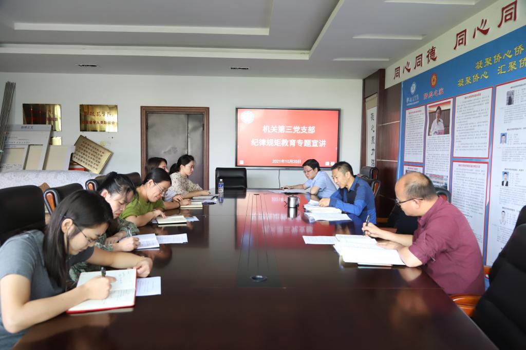 10月20日下午,机关第三党支部结合学校“学党史、强自律”党史学习教育和《自律攀大人纪律规矩教育工作方案》的相关要求和学习内容,开展专题宣讲,机关第三党支部全体党员同志参加学习。