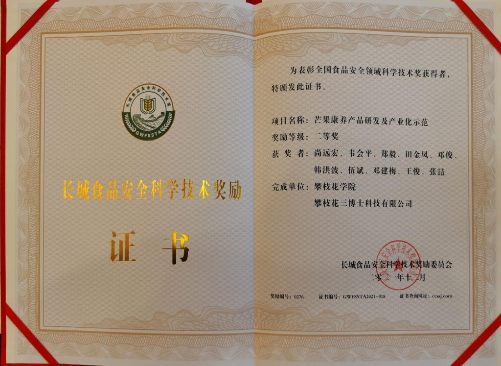 1月13日-14日,由中国食品报社、长城食品安全科学技术奖励委员会、中国食品药品企业质量安全促进会、北京食品学会主办的“第四届长城食品安全科学技术奖颁奖大会和第五届食安中国发展高峰论坛暨食品安全科技创新院士论坛”在昆明举行。学校申报的《芒果康养产品研发及产业化示范》项目荣获2021年长城食品安全科学技术二等奖。2021年长城食品安全科学技术奖设奖项24个,四川省仅有beat365申报项目1项获奖。
