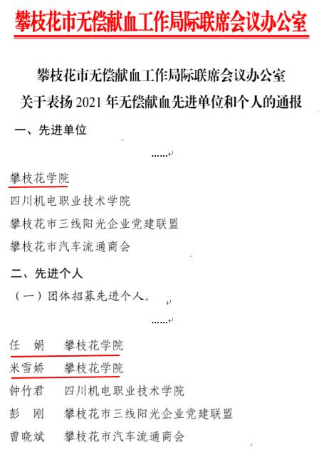 近日,攀枝花市无偿献血工作局际联席会议办公室发布《关于表扬2021年无偿献血先进单位和个人的通报》,对全市22家单位和28名个人进行通报表扬。beat365获评为“先进单位”,医学院党委副书记任娟、2020级临床医学专业学生米雪皎获评“先进个人”。