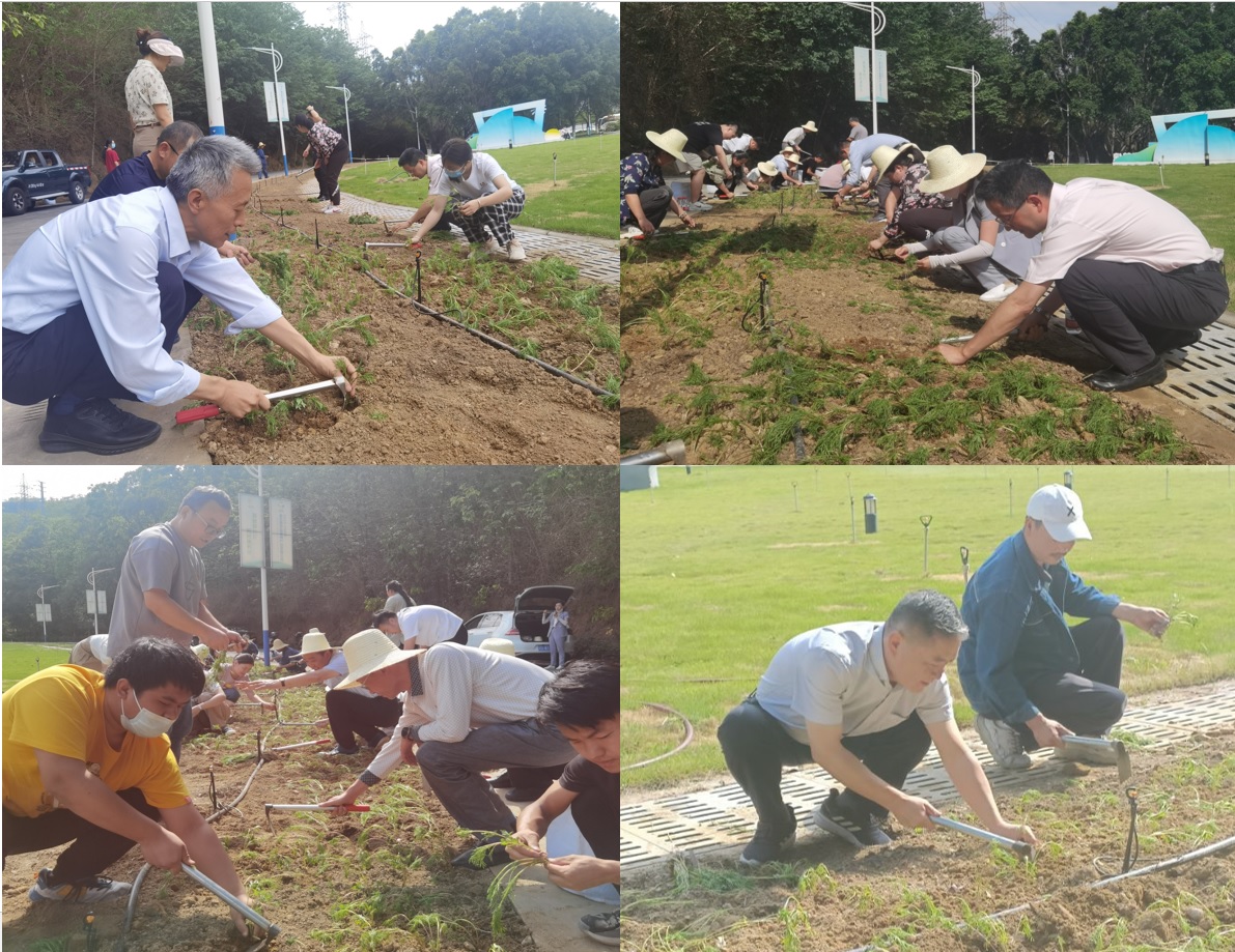 政治学习结束后,支部全体党员、学生代表及资产经公司工作人员齐聚产教融合大楼前草坪边侧。在专业园艺设计师、校工师傅的指导下,大家纷纷拿起锄头、花苗,按“思泉汩汩—绿草茵茵—花朵飞扬”的层叠设计理念,小心翼翼地将一棵棵格桑花苗栽种到规划好的环形地带里。师生们一手挖坑、一手培苗,动作娴熟干练。随着“绿茵带”渐渐蔓延舒展,大家开始汗水淋漓,脸被太阳晒得通红,不少老师、同学胳膊、脚踝被飞虫、蚂蚁叮伤,但大家仍全神贯注在劳动中,直到百余米环形花园全都栽满花苗。看着自己亲手栽种的花苗如绿丝带在脚下绵延,劳动创造之美,如此让人幸福。