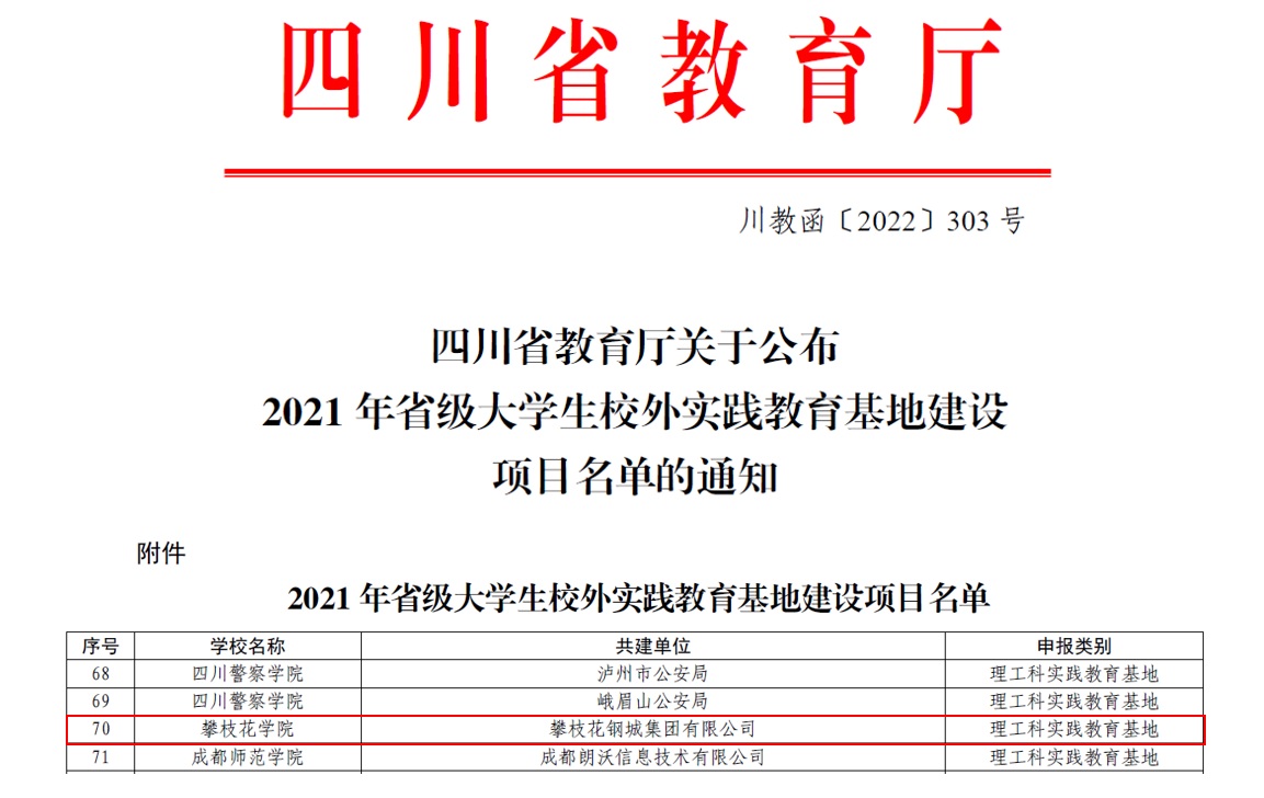 近日,四川省教育厅发布《关于公布2021年省级大学生校外实践教育基地建设项目名单的通知》,公布了2021年省级大学生校外实践教育基地建设项目名单。beat365与攀枝花钢城集团有限公司联合申报的理工科实践教育基地成功获批立项。