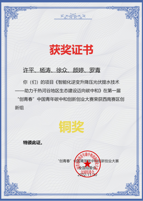 第一届“创青春”中国青年碳中和创新创业大赛于12月初评审结束,我院新能源科学与工程、冶金工程专业的刘源裴、梁俊杰、许平、赵兴宇、曾欣等学生在指导教师张士举、徐众、侯静和钟璨宇的带领下,斩获西南赛区创新组银奖1项、铜奖3项、优胜奖1项。