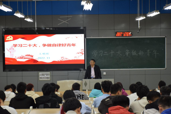 学院党委负责人首先带领同学们学习了二十大报告,接着通过三个方面来阐述如何“学习二十大 争做自律好青年”。一是在新时代十年的伟大变革中坚定自信。二是在新发展格局的广阔舞台上铸就自强。三是在新征程阶段的吃苦奋斗中践行自律。最后他告知同学们,作为当代青年要有奋斗目标,专注学习,全身心投入热爱的事业,然后付诸行动。