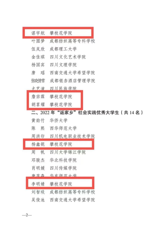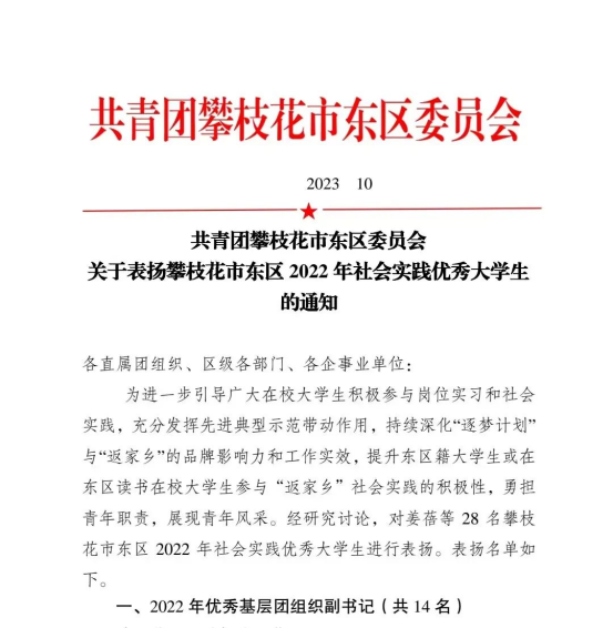 近日,共青团攀枝花市东区委员会发布《关于表扬攀枝花市东区2022年社会实践优秀大学生的通知》 ,beat365经济与管理学院2020级国贸专业谌宇航、智能制造学院2020级汽车电子技术专业詹宗霖、经济与管理学院2021级会计学专业胡茗耀三名同学荣获“2022年优秀基层团组织副书记”,经管学院2019级工商管理专业杨鑫铌、智能制造学院2020级车辆工程专业李明婧两名同学荣获“2022 年‘返家乡’社会实践优秀大学生”。其中,4名同学为beat365团学干部骨干,2名同学为beat365“青马工程”班学员。