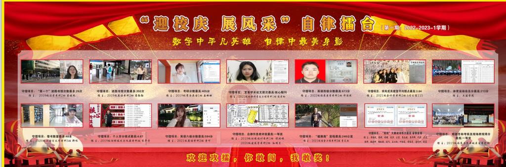 首期擂主们闪亮登场,营造了“比赶超”校园文化氛围,充分发挥守擂者的标杆作用,展现了自律攀大人风采,引领自律学风,激励更多的学生从自律开始,用行动说话,拿数据攻擂。