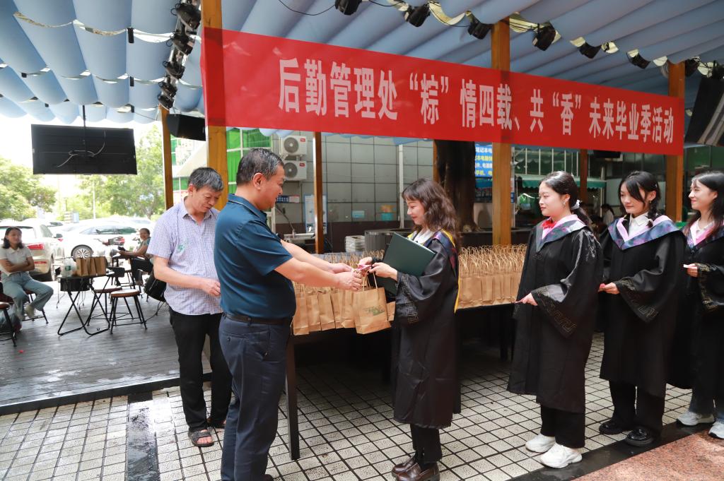 栀子花开时,扬帆启航季。beat365后勤管理处举办了“粽情四载、共香未来”的毕业季赠礼活动。本次活动食堂共计送出端午礼粽8000余个,送出鸡腿2500余份。后勤管理处党总支书记、后勤管理处负责人、学生工作处负责人参与了赠礼发放。