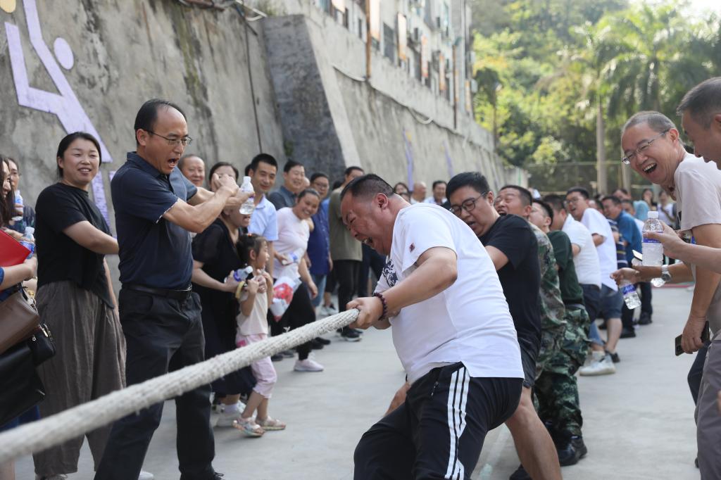 当比赛哨声响起,队员们齐心协力,双手握绳、咬紧牙关、压低重心,脚蹬地,身后倾,铆足劲往后拉。尽显戮力同心、团结协作的精神面貌。啦啦队员的加油助威声更是此起彼伏、声浪一浪高过一浪,激发了队员的热情,使比赛显得更加激烈精彩。