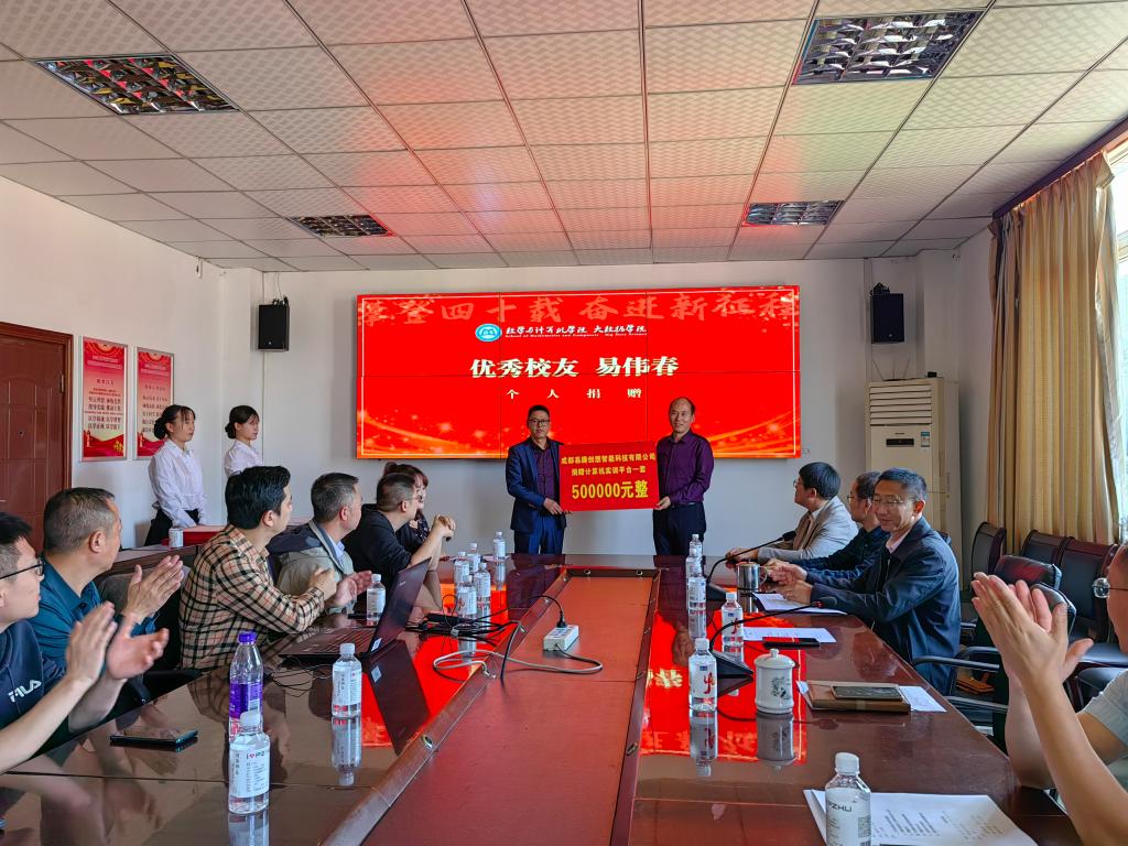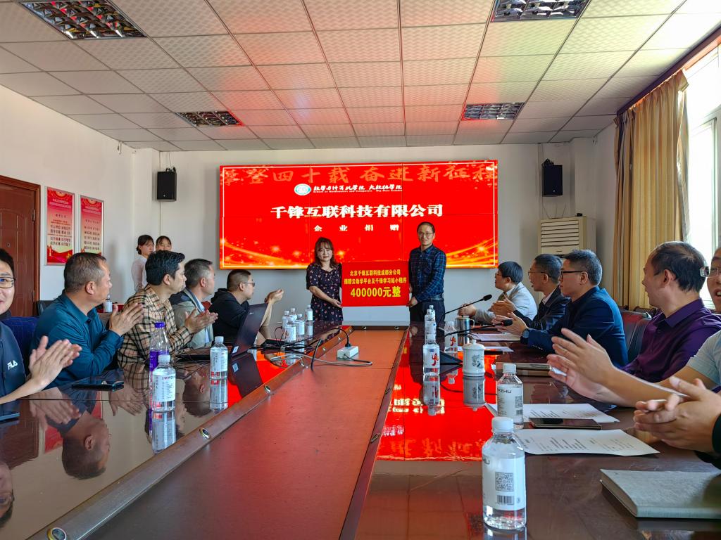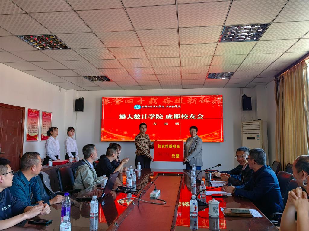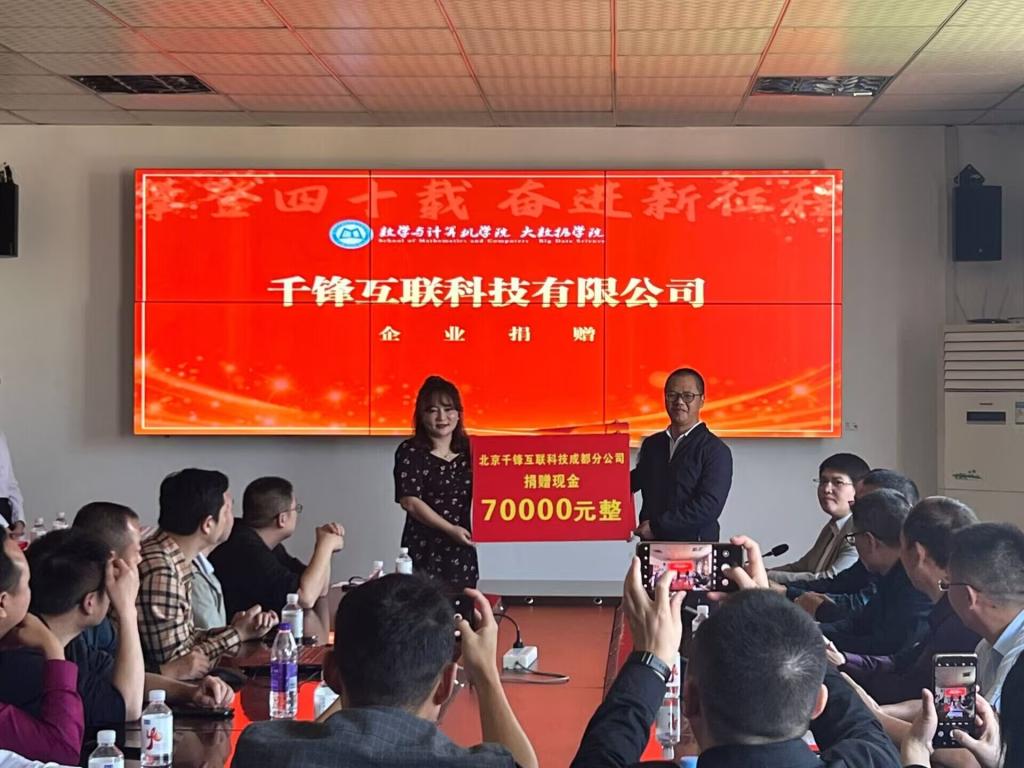 捐赠仪式上,数计学院领导班子代表学院接受校友企业千锋互联科技有限公司捐赠软件价值40万元、现金7万元;学院成都校友会捐赠现金3.4731万元;优秀校友易伟春捐赠计算机实训平台一套价值50万元。