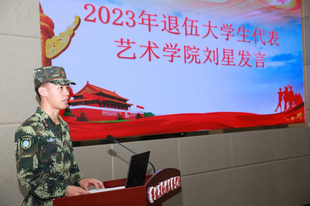 2023年退伍大学生代表艺术学院刘星发言,他分享了自己的当兵经历,并号召退伍大学生们要爱党爱国,听党话跟党走,怀抱梦想,脚踏实地,砥节砺行,踔厉奋发。