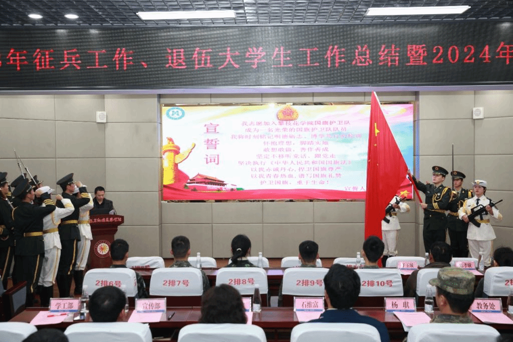 会上,国旗护卫队进行了交接仪式,第十一届国旗护卫队接过国旗后庄严宣誓。学校武装部负责人总结了2023年大学生征兵及退伍大学生工作。