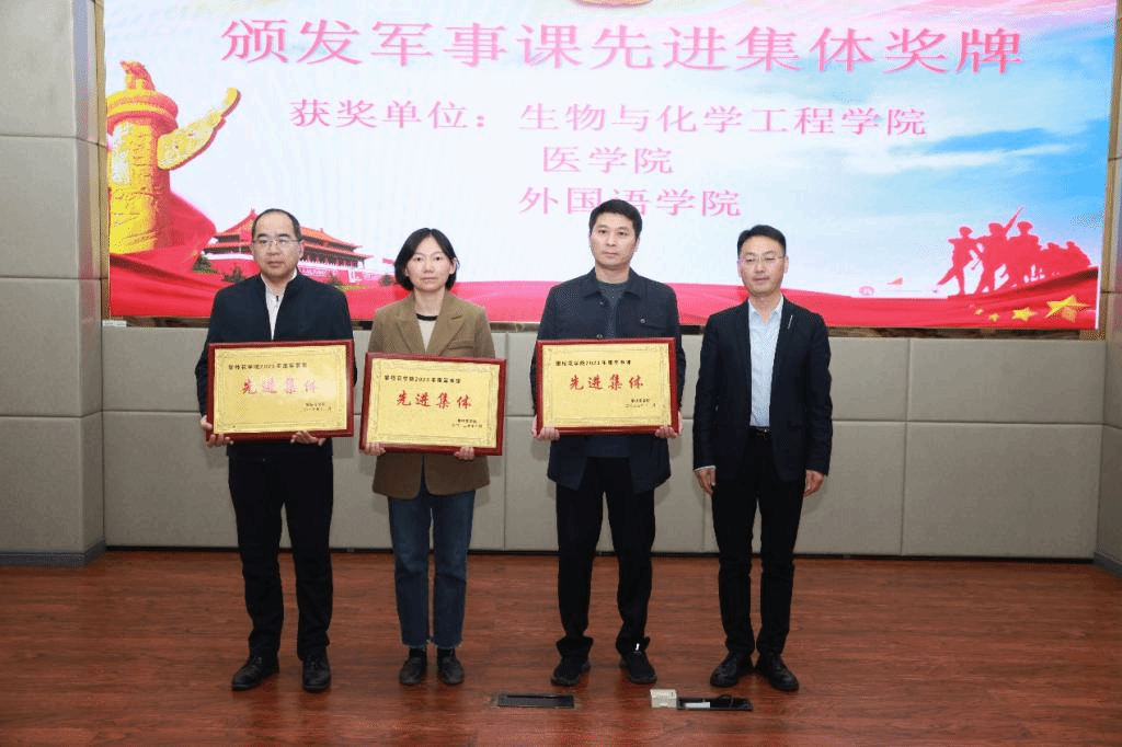 校武装部为生物与化学工程学院、医学院、外国语学院颁发2023年军事课先进集体奖牌。