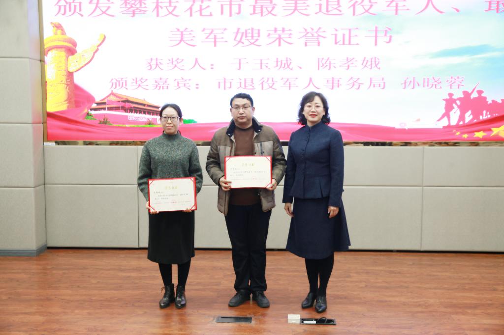 市退役军人事务局副局长孙晓蓉向于玉城、陈孝娥颁发攀枝花市最美军人、攀枝花市最美军嫂证书。