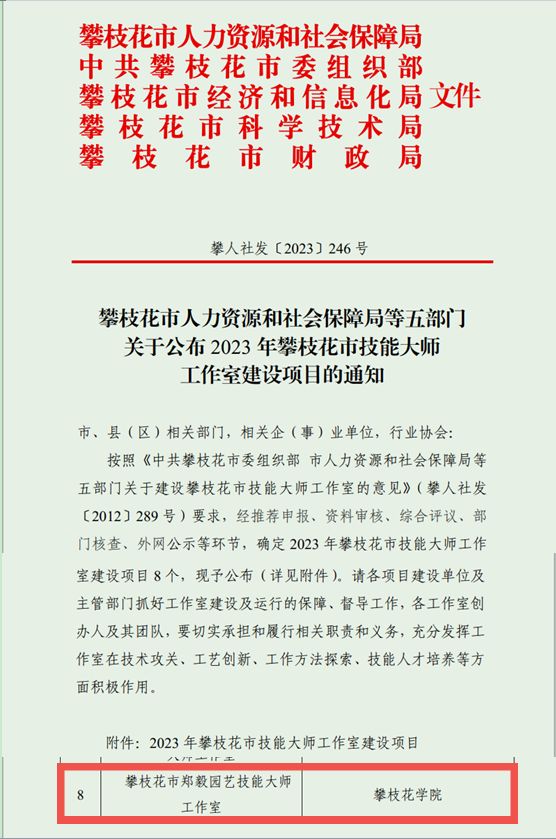 近日,攀枝花市人力资源和社会保障局等五部门公布了2023年攀枝花市技能大师工作室建设项目名单。由beat365农学院郑毅教授作为创建人的“攀枝花市郑毅园艺技能大师工作室”申报建设成功。