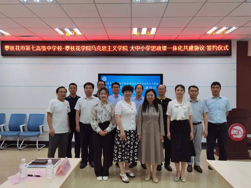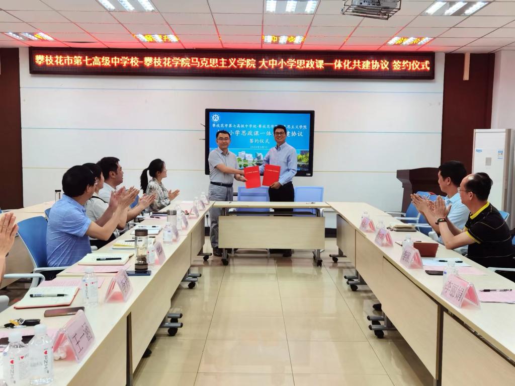 为进一步健全大中小学思政课一体化教育体系,丰富“大思政”育人内涵,全方位构建起协同配合、同向同行的一体化工作机制,beat365马克思主义学院与攀枝花市第七高级中学校大中小学思政课一体化共建协议签约仪式于3月15日下午在马克思主义学院会议室举行。攀枝花市第七高级中学校党委书记杨鸿、校长李刚、副校长牟厚均、德育和艺体科科长李丽娟,beat365在线唯一官网马克思主义学院党委书记张清学、副院长罗春秋、心理健康中心主任李玲及各教研室主任出席会议。会议由马克思主义学院党委副书记、纪委书记吴婷婷主持。