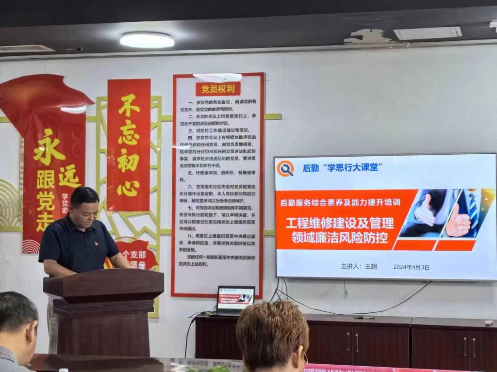会后,举办了后勤“学思行大课堂”,后勤党总支委员、后勤管理处处长王超教授作题为《工程维修建设及管理领域风险防控》专题讲座。